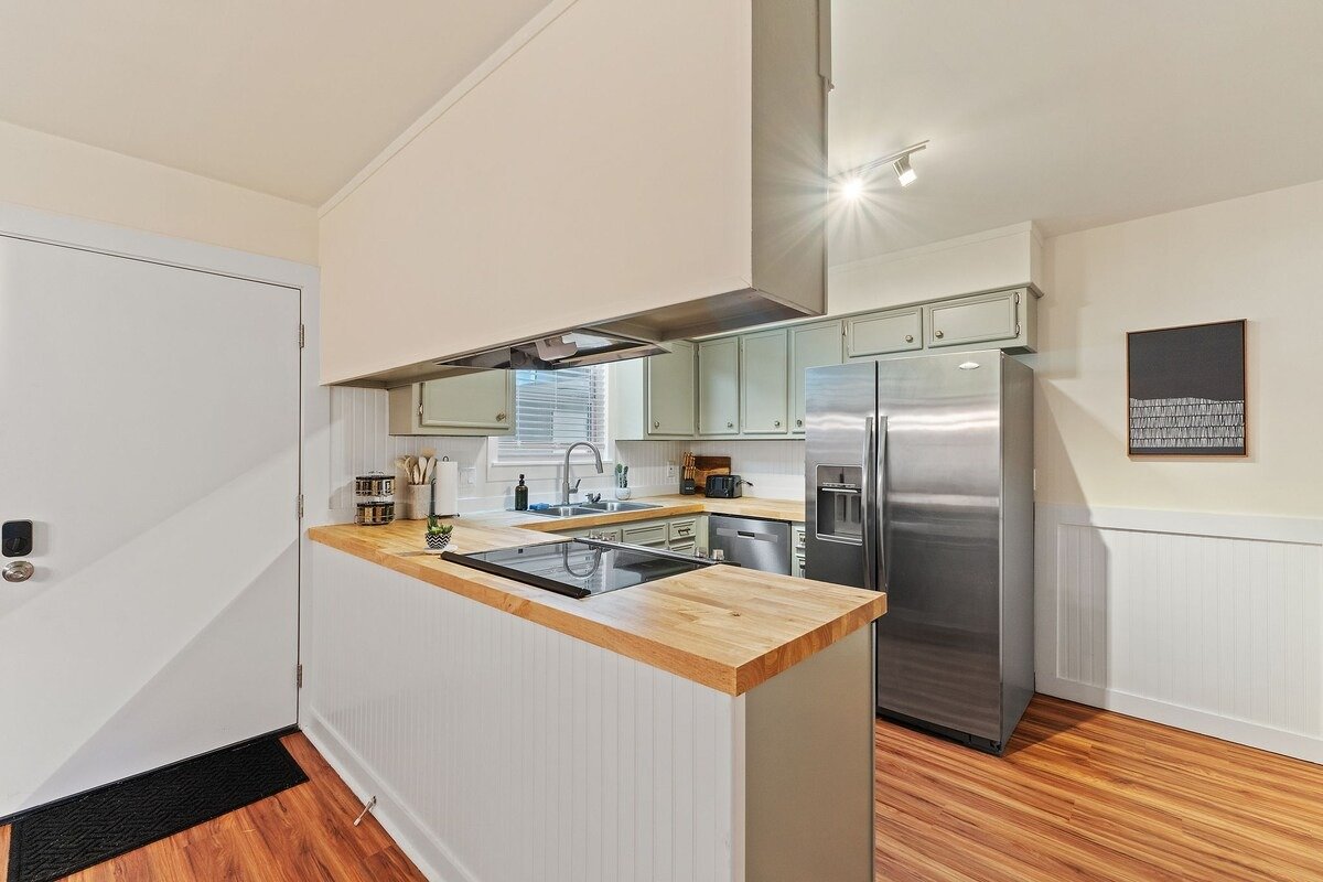 The kitchen is a standout, featuring modern appliances. Whether you’re preparing a simple meal or cooking for a crowd, this kitchen is equipped to meet all your culinary needs.
